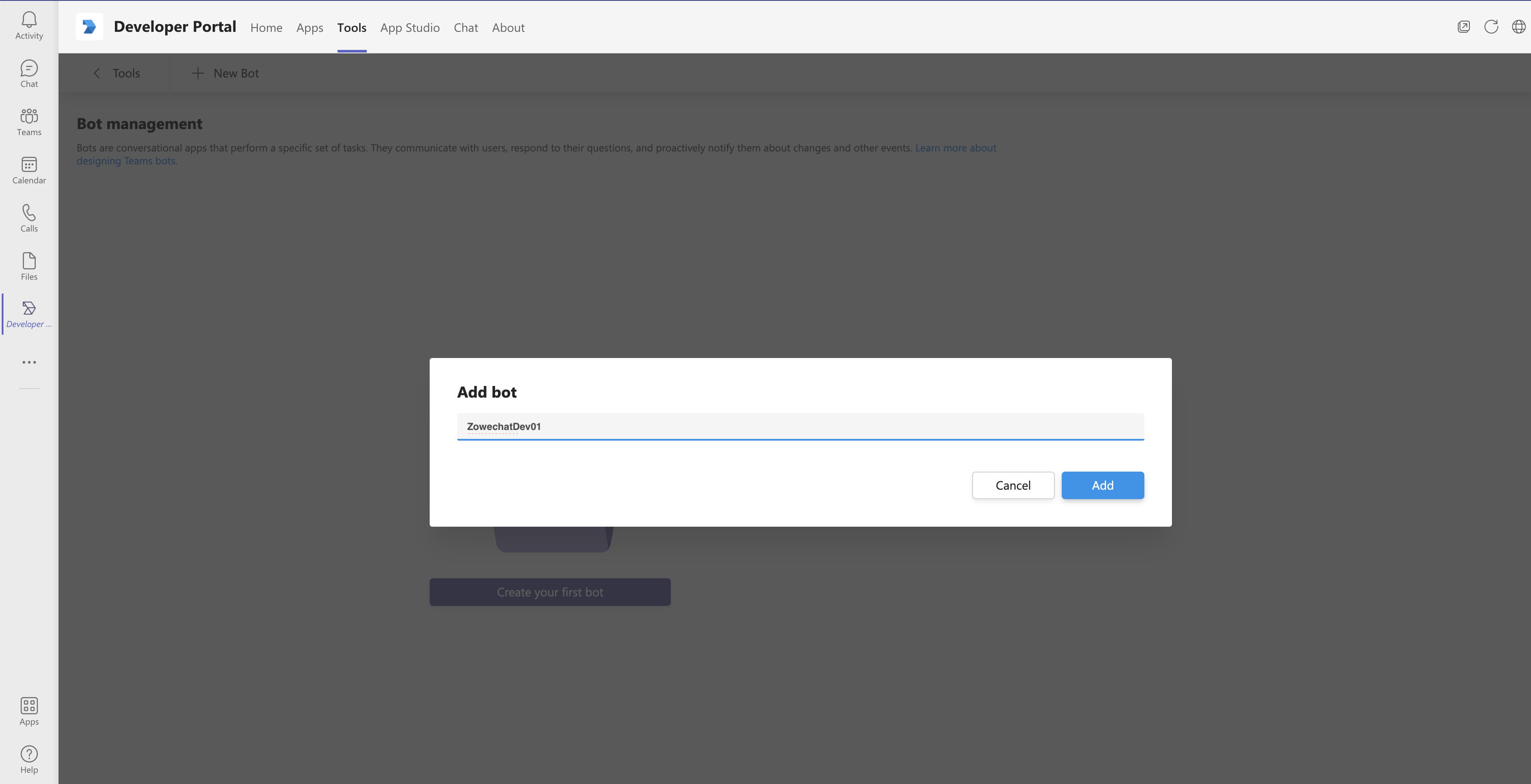 4. In the prompted dialog, specify a short name for your bot and then click Add.